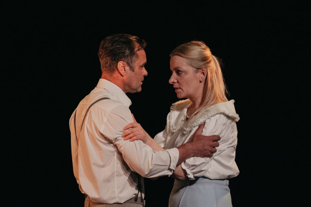 Galvenos varoņus, laulātu pāri Mariju un Pēteri, izrādē attēlo Jolanta Pinkule vai Anita Hofmane (attēlā) un Dainis Trēziņš. Foto: Ginta Špate