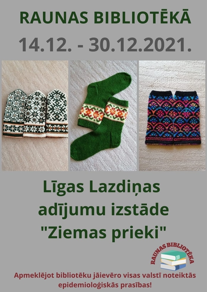 Raunas bibliotēkā no 14. – 30. decembrim aplūkojama Līgas Lazdiņas adījumu izstāde “Ziemas prieki”, kurā apskatei izlikti dažādi adīti cimdi un zeķes.