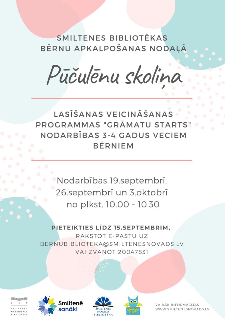 Smiltenes bibliotēkas Bērnu apkalpošanas nodaļa aicina 3 – 4 gadus vecus bērnus kopā ar vecākiem piedalīties lasīšanas veicināšanas programmas “Grāmatu starts” nodarbībās “Pūčulēnu skoliņa”.