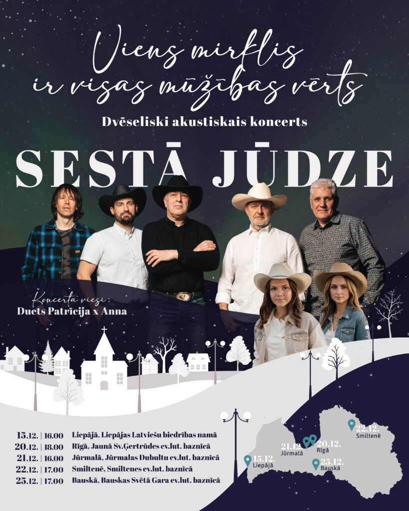 Īsi pirms Ziemassvētkiem un gadumijas, kad gaisā virmos piparkūku, eglīšu un mandarīnu smarža, bet daudziem no mums prātus aizvien neatvairāmāk pārņems cerība un ticība gaišākai rītdienai, Latvijas titulētākā kantrimūzikas grupa “Sestā Jūdze” savus klausītājus aicinās noklausīties sirsnīgu Ziemassvētku dziesmu programmu dvēseliski akustiskajā Ziemassvētku koncertā “Viens mirklis ir visas mūžības vērts”.