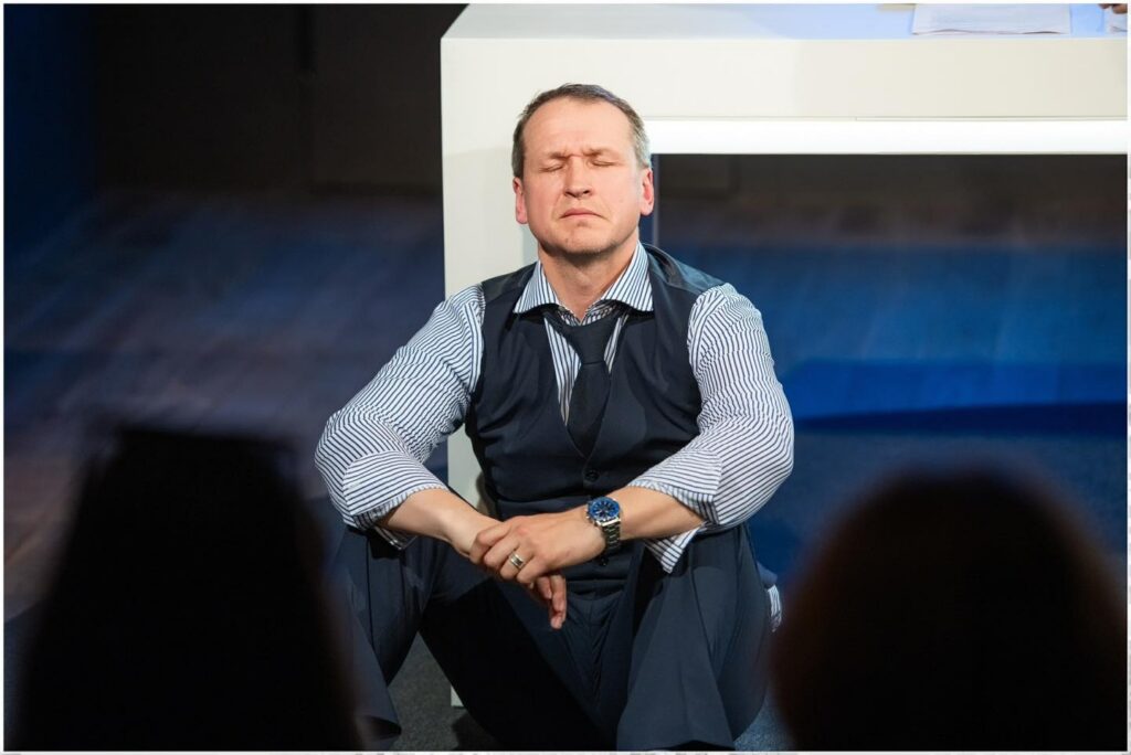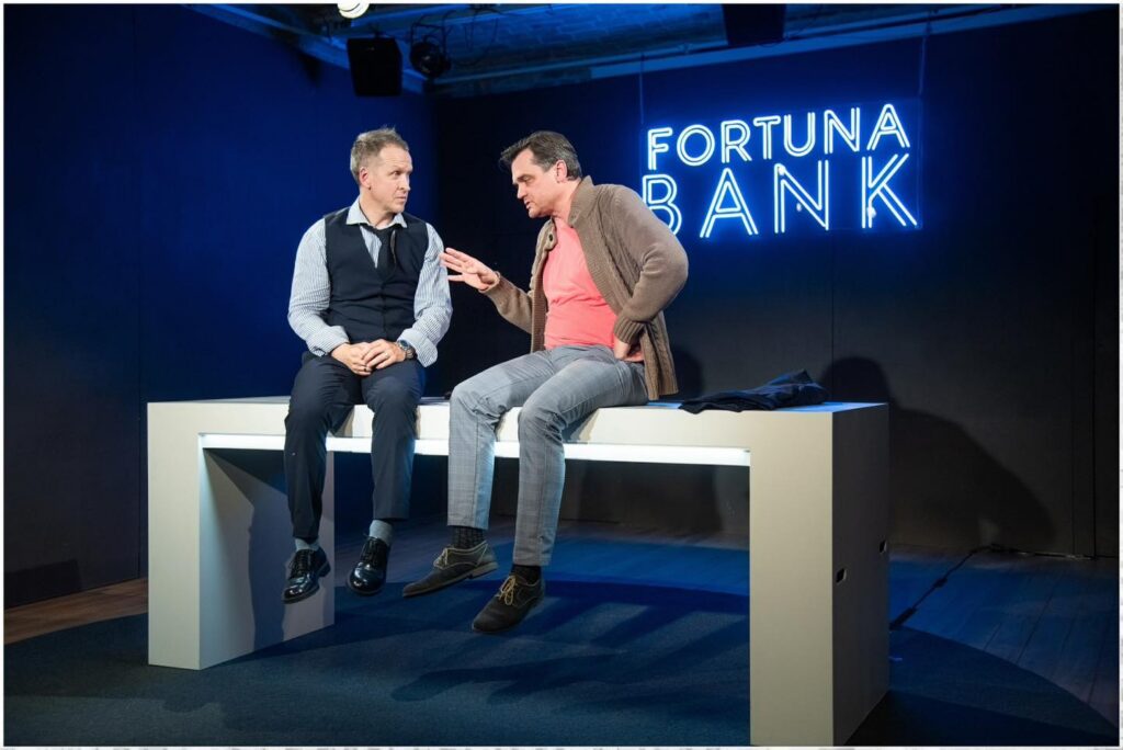 “Strādājot ar Žordī Galserāna lieliski sarakstīto lugu “Uz visu banku!” (oriģ. nosaukums “Kredīts”), mani kā režisoru vienmēr saista iespēja parakties dziļāk par virsējo kārtu. Un, ja izdodas tikt līdz pat kodolam, tad gandrīz vienmēr rezultātā gandarījums ir daudz lielāks. Šī reize nav izņēmums, turklāt veidot izrādi kopā ar diviem savas paaudzes vadošajiem aktieriem – Arti Robežnieku un Normundu Laizānu – ir ne vien nebijusi pieredze, bet arī radošs izaicinājums, jo abi meistari savas dzīves labākos gadus atdevuši skatuves dēļiem un pazīst “drēbi”, tādējādi teicami papildina kopdarbu ar savu pienesumu. Šī luga ir viltīga. Labā nozīmē, protams. Tā izklaidē, sapurina, uzdod jautājumus. Mūsu kopīgi izvēlētais izrādes žanra apzīmējums “nopietna komēdija” nav nejaušs. Tas dod iespēju caur jokiem parunāt par nopietnām lietām, un arī otrādi,” savu ideju un lugu raksturo izrādes režisors Intars Rešetins-Pētersons.