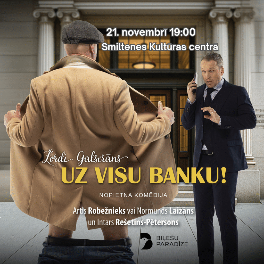 21. novembrī Smiltenes Kultūras centrā viesosies Intara Rešetina-Pētersona režijā veidotā komēdija “Uz visu banku!”, kurā galvenajās lomās ir pats režisors un Normunds Laizāns vai Artis Robežnieks.