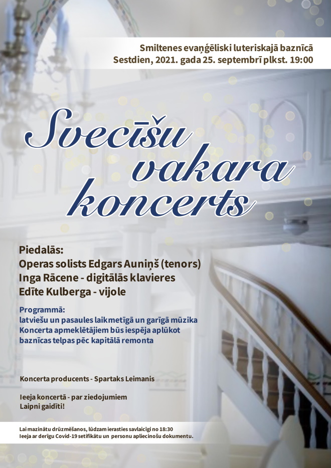 Sestdien, 25.septembrī, plkst.19.00 Smiltenes evaņģēliski luteriskajā baznīcā notiks Svecīšu vakara koncerts, kurā piedalīsies operas solists Edgars Auniņš (tenors), Inga Rācene (digitālās klavieres) un Edīte Kulberga (vijole).