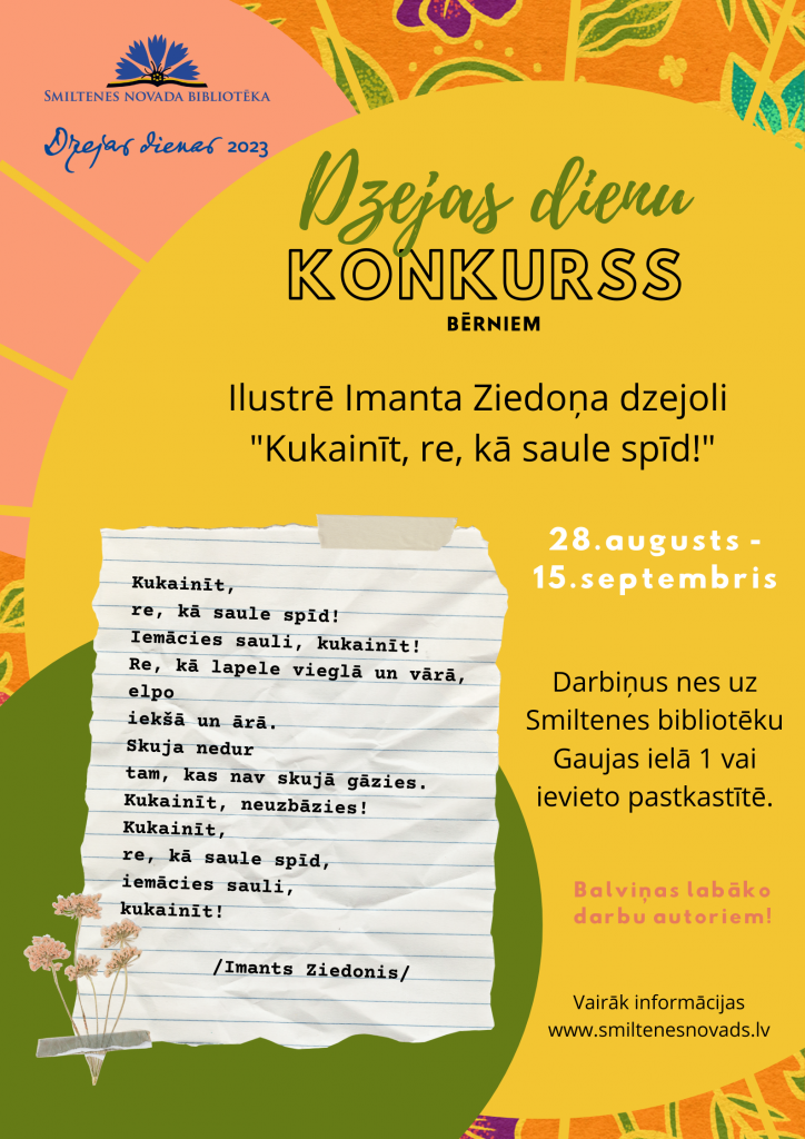 Smiltenes bibliotēkas Bērnu apkalpošanas nodaļa aicina visus mazos māksliniekus piedalīties aizraujošā Dzejas dienu zīmējumu konkursā un ilustrēt dzejoli! Šogad esam izvēlējušies Imanta Ziedoņa dzejoli “Kukainīt, re, kā saule spīd!” kā iedvesmas avotu.