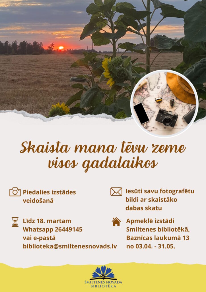Smiltenes bibliotēka aicina ikvienu piedalīties foto izstādes “Skaista mana tēvu zeme visos gadalaikos” veidošanā.