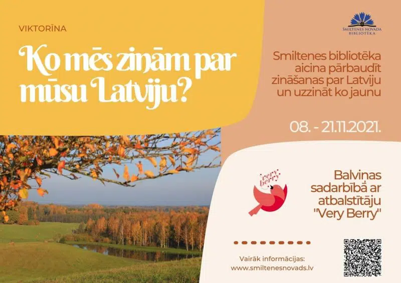 Sagaidot Latvijas Republikas proklamēšanas gadadienu, Smiltenes nobada bibliotēka no 8.novembra līdz 21.novembrim aicina piedalīties digitālā viktorīnā “Ko mēs zinām par mūsu Latviju?”, lai pārbaudītu zināšanas par mūsu valsti un uzzinātu ko jaunu.