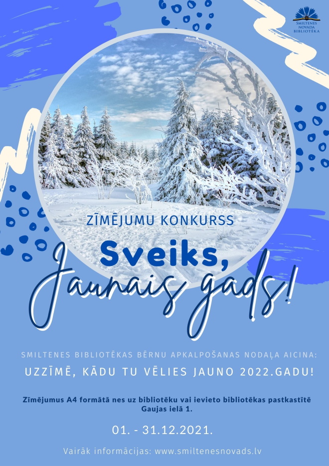 Kādu Tu vēlies Jauno gadu? Uzzīmē to! Smiltenes bibliotēkas Bērnu apkalpošanas nodaļa aicina bērnus līdz 16 gadu vecumam piedalīties zīmējumu konkursā “Sveiks, Jaunais gads!”. Bērni aicināti zīmējumos attēlot savas Jaunā gada vēlmes, notikumus, sapņus un jebko citu, kam Jaunajā gadā vajadzētu notikt, kādam tam vajadzētu izskatīties. Konkurss norisināsies no 1.decembra līdz 31.decembrim.