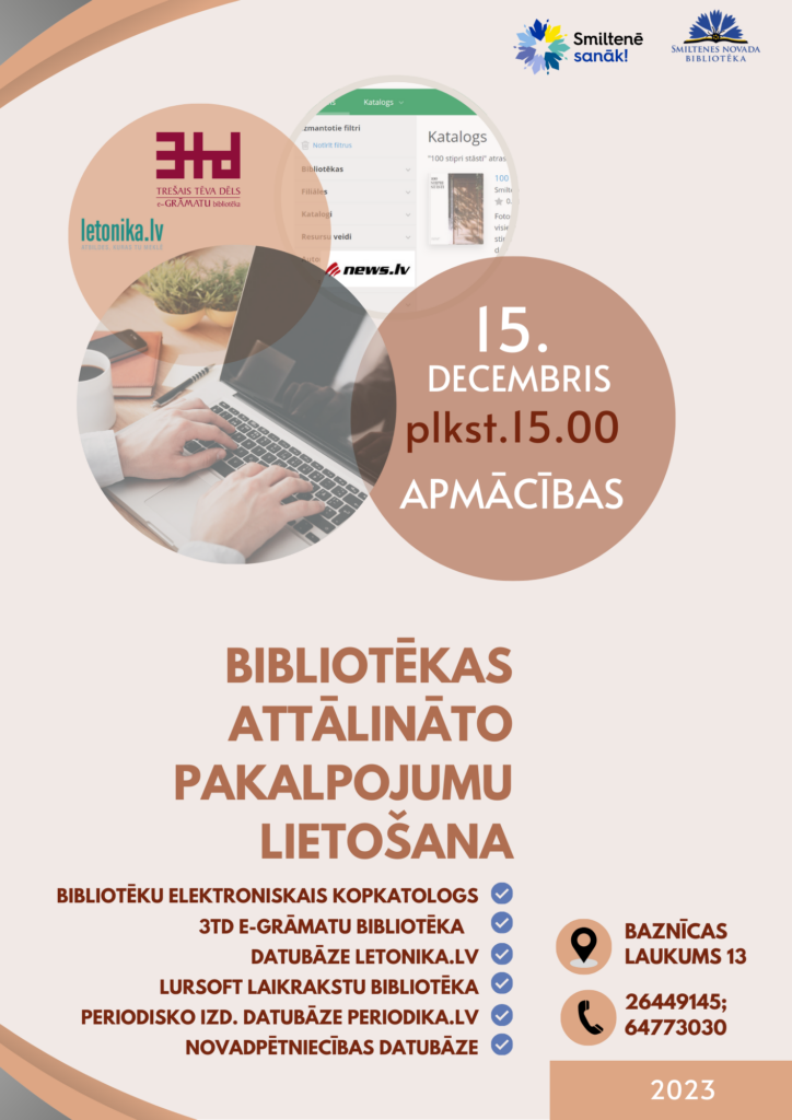 Piektdien, 15.decembrī plkst.15.00, Baznīcas laukumā 13 notiks apmācības par dažādiem bibliotēkas piedāvātajiem attālinātajiem pakalpojumiem – elektroniskā kataloga izmantošanas iespējām, 3td e-grāmatu bibliotēku, autorizēto tiešsaistes datubāzi Letonika, Lursoft laikrakstu bibliotēku un bibliotēkas veidoto novadpētniecības datubāzi. Apmācības paredzētas visiem interesentiem, kas vēlas iepazīt Smiltenes bibliotēkas darbības virzienus un piedāvātos pakalpojumus.