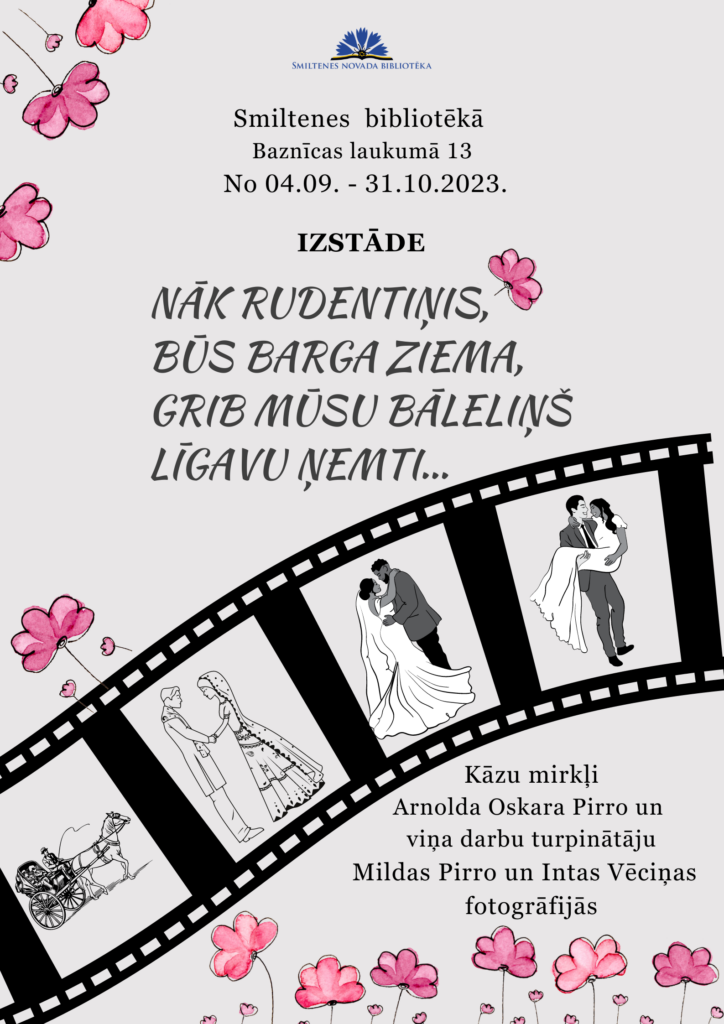 Smiltenes bibliotēkā līdz 31.oktobrim apskatāma kāzu tematikai veltīta izstāde “Nāk rudentiņis, Būs barga ziema, Grib mūsu bālēliņš Līgavu ņemti”, īpašu vietu atvēlot novadnieku Arnolda Oskara Pirro, Mildas Pirro un Intas Vēciņas uzņemtajām kāzu fotogrāfijām.