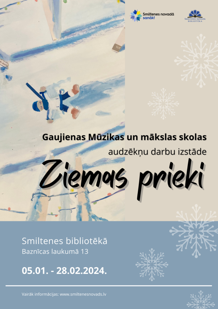 Smiltenes bibliotēkā Baznīcas laukumā 13 no 5.janvāra skatāma izstāde “Ziemas prieki”, kurā redzami 20 Gaujienas Mūzikas un mākslas skolas audzēkņu darbi. Tie tapuši gleznošanas, kompozīcijas, zīmēšanas un datorgrafikas nodarbībās skolotāju V. Jaukules, M. Kārkliņas, I. Riepnieces un D. Lazdiņas – Ivanovas vadībā.