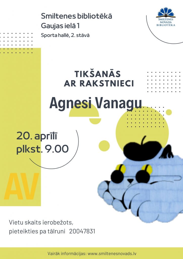 Trešdien, 20. aprīlī, plkst. 9.00 Smiltenes bibliotēkas Bērnu apkalpošanas nodaļā (Gaujas ielā 1, Sporta hallē 2.stāvā) viesosies rakstniece Agnese Vanaga.