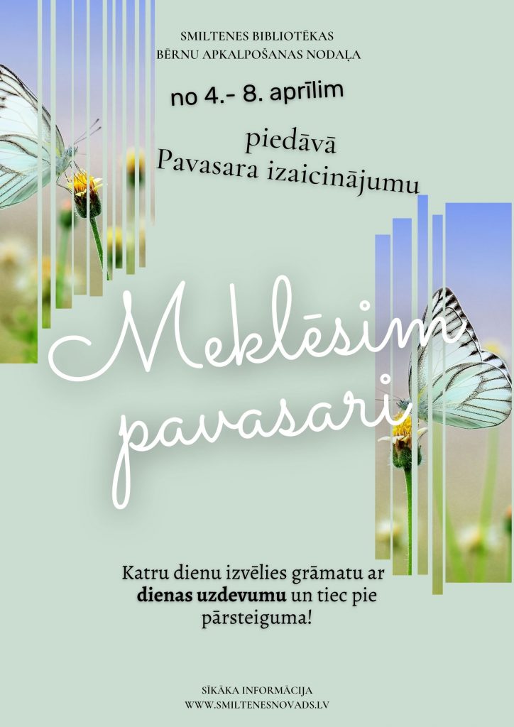 Smiltenes bibliotēkas Bērnu apkalpošanas nodaļa no 4. līdz 8. aprīlim aicina bērnus iesaistīties pavasara izaicinājumā “Meklēsim pavasari”. Pavasaris ir pietuvojies ar lieliem soļiem, daba lēnām mostas. Bibliotēka izaicina arī grāmatās atrast pavasari!