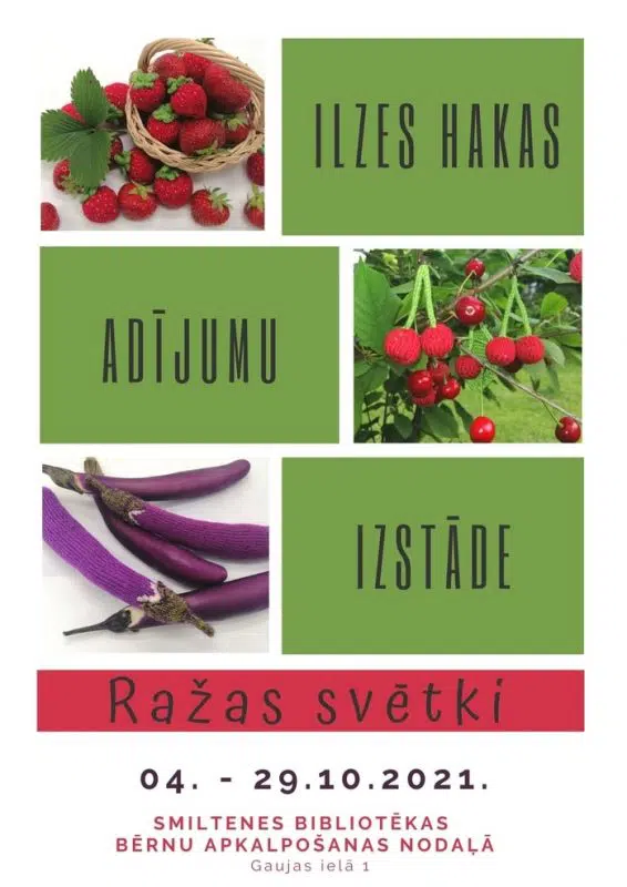 Smiltenes bibliotēkas Bērnu apkalpošanas nodaļā no 4. oktobra līdz 29. oktobrim apskatāma Ilzes Hakas adījumu izstāde “Ražas svētki”, kurā aplūkojami dažādi adīti dārzeņi, augļi, ogas un sēnes.
