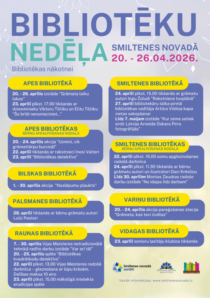 Turpinot šo tradīciju, arī Smiltenes novada bibliotēkas ir sagatavojušas daudzveidīgu un aizraujošu pasākumu programmu dažādām vecuma grupām. Nedēļas laikā bibliotēkas kļūs par tikšanās, izziņas un radošuma vietām, piedāvājot aktivitātes, kas veicina lasītprieku, novadpētniecību un vietējās kopienas saliedētību.