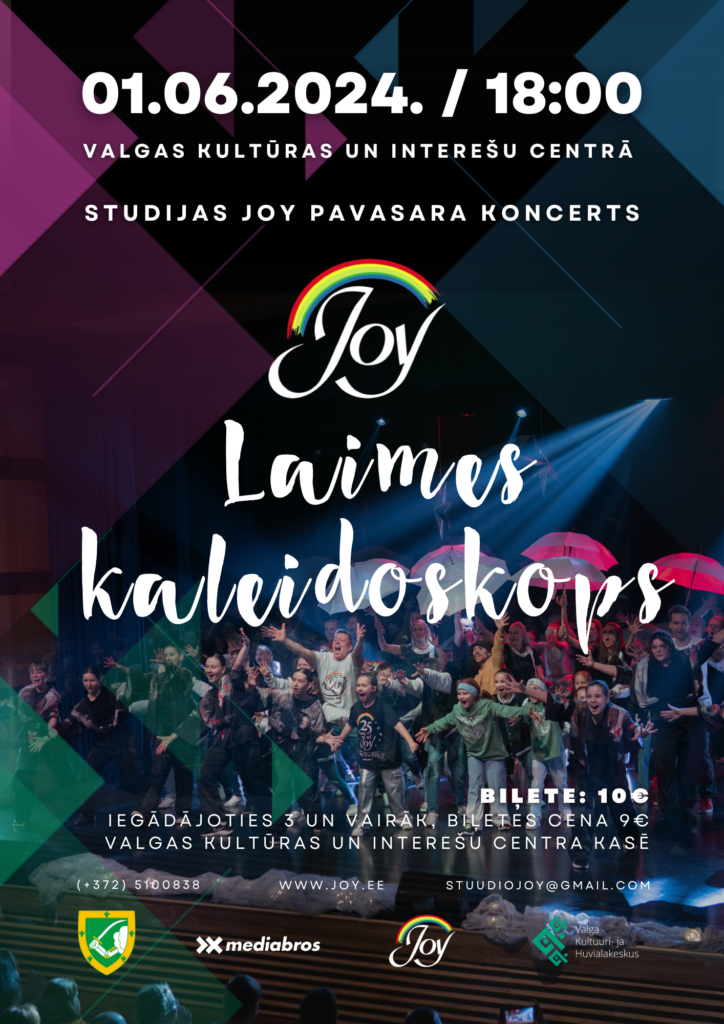 Starptautiskajā bērnu aizsardzības dienā – 1. jūnijā plkst.18:00 Valgas kultūras un interešu centrā jau 29. reizi norisināsies studijas JOY tradicionālais pavasara koncerts “Laimes kaleidoskops”. Pavasara koncerts būs lieliska iespēja baudīt krāšņu studijas JOY solistu un deju kolektīvu priekšnesumu kaleidoskopu.