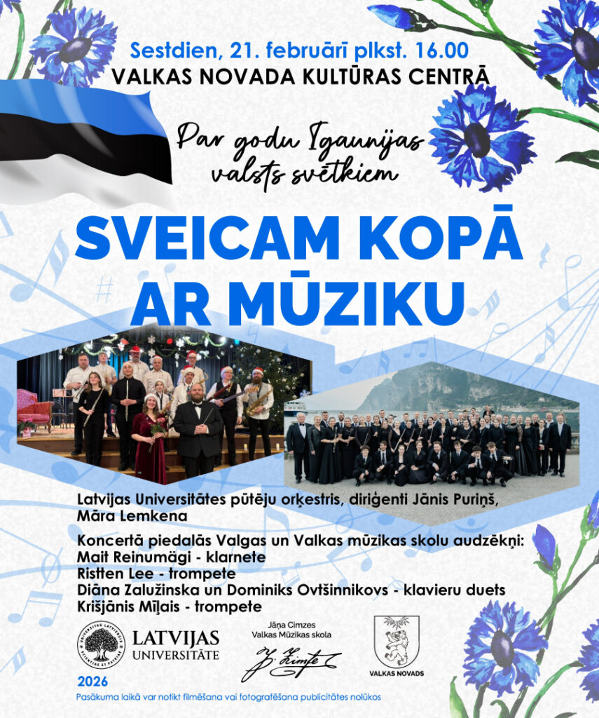 Sestdien, 21. februārī, plkst. 16.00 Valkas novada Kultūras centrā notiks svētku koncerts “Sveicam kopā ar mūziku” par godu Igaunijas Republikas Neatkarības 108. gadadienai un Latvijas–Igaunijas kultūras draudzībai.