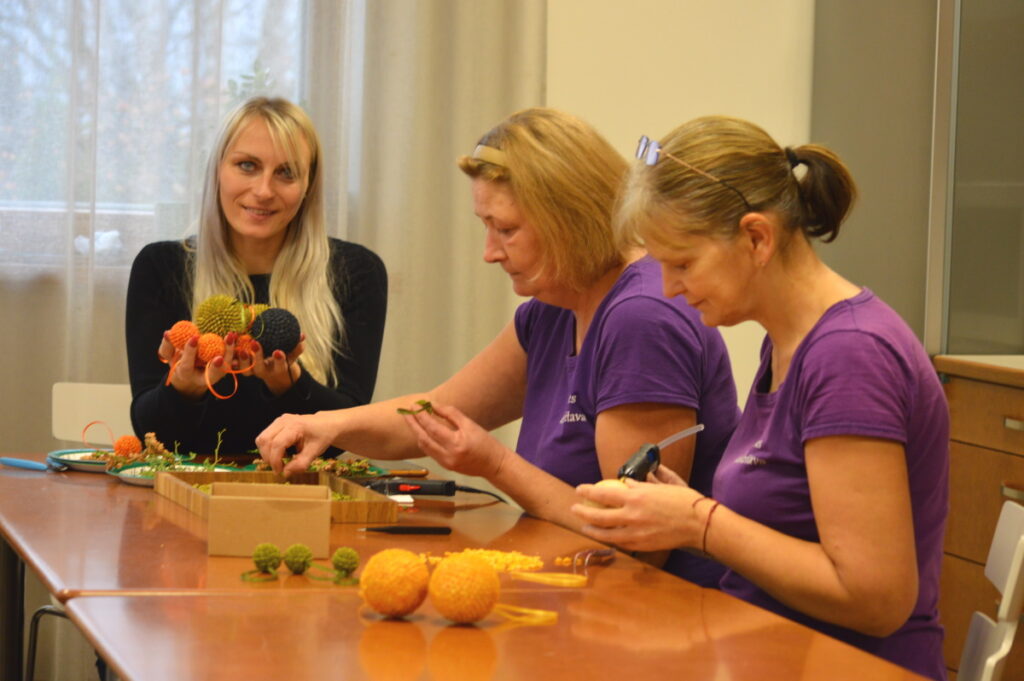Smiltenes kokaudzētavas darbinieču izgatavotos gaumīgos, skaistos svētku dekorus daudzi cilvēki jau zina un novērtē. “Aizvadītā gada pēdējā mēnesī līdz Ziemassvētkiem strādājām tikai uz pasūtījumiem, jo viss, ko saražojām, tika ātri izpirkts. Bet to, ka mūsu darba rezultātu vajag parādīt plašākam cilvēku lokam, sapratām pagājušajā gadā, kad kokaudzētavas apmeklētāji teica – “pie jums ir kā izstādē”. Mūsu telpas nav tik plašas, tāpēc uzrunājām Smiltenes novada muzeju Mēru muižā, mūs tur labprāt uzņēma, un, manuprāt, rezultāts ir labs,” vērtē Baiba Miķe.