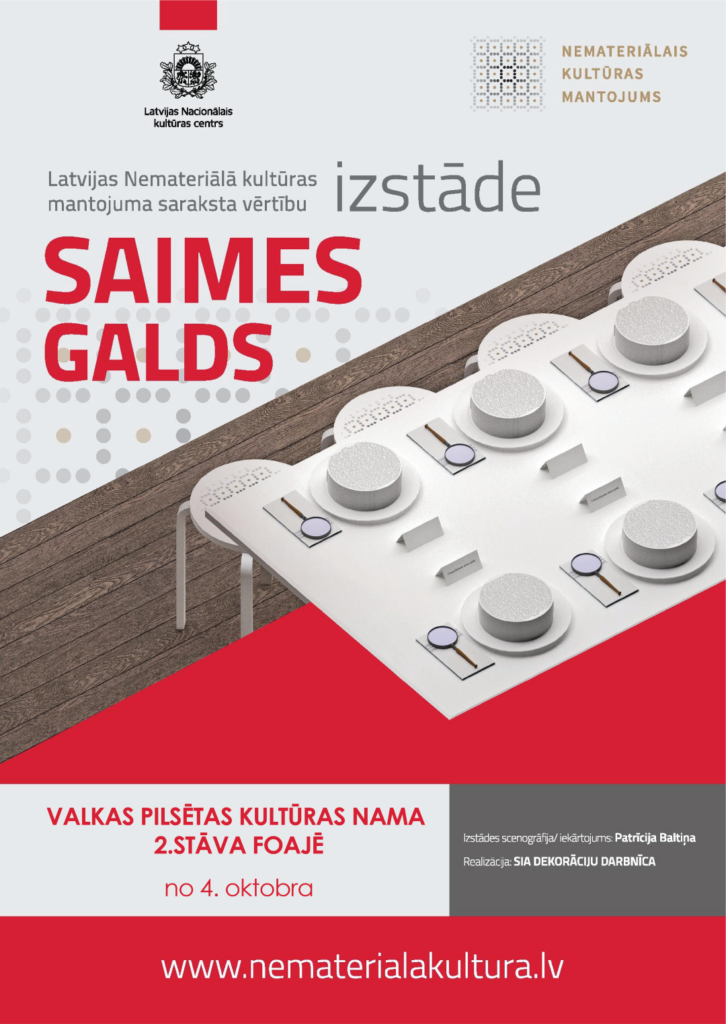 Valkas pilsētas kultūras nama 2. stāva foajē apskatāma izstāde “Saimes galds”, kas ikvienu interesentu iepazīstina ar Latvijas nemateriālā kultūras mantojuma saraksta vērtībām.