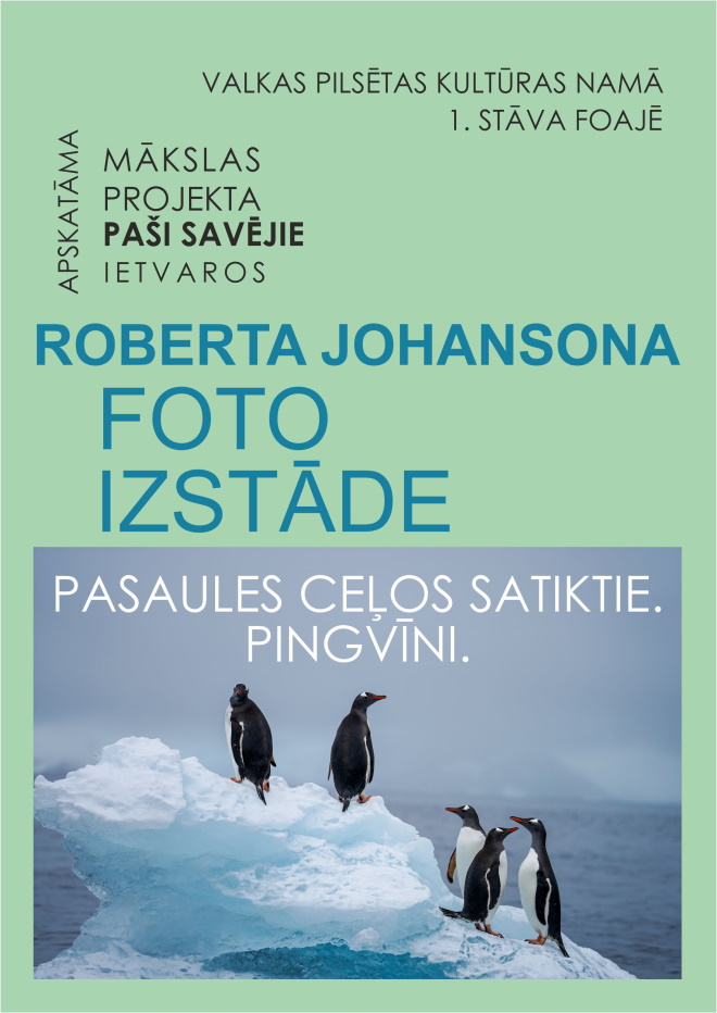 Valkas pilsētas kultūras nama 1.stāva foajē no 22. septembra skatāma fotogrāfa Roberta Johansona izstāde “Pasaules ceļos satiktie. Pingvīni.”