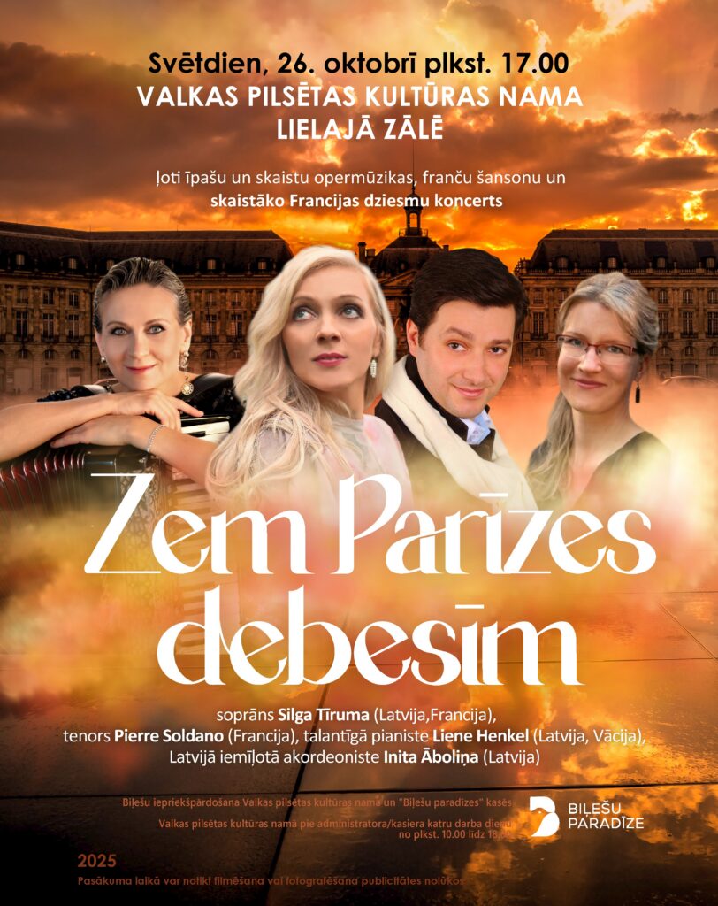 Svētdien, 26. oktobrī, plkst. 17.00 Valkas pilsētas kultūras nama (E. Dārziņa ielā 8, Valkā) lielajā zālē notiks ļoti īpašu un skaistu opermūzikas, franču šansonu un skaistāko Francijas dziesmu koncerts “Zem Parīzes debesīm”.