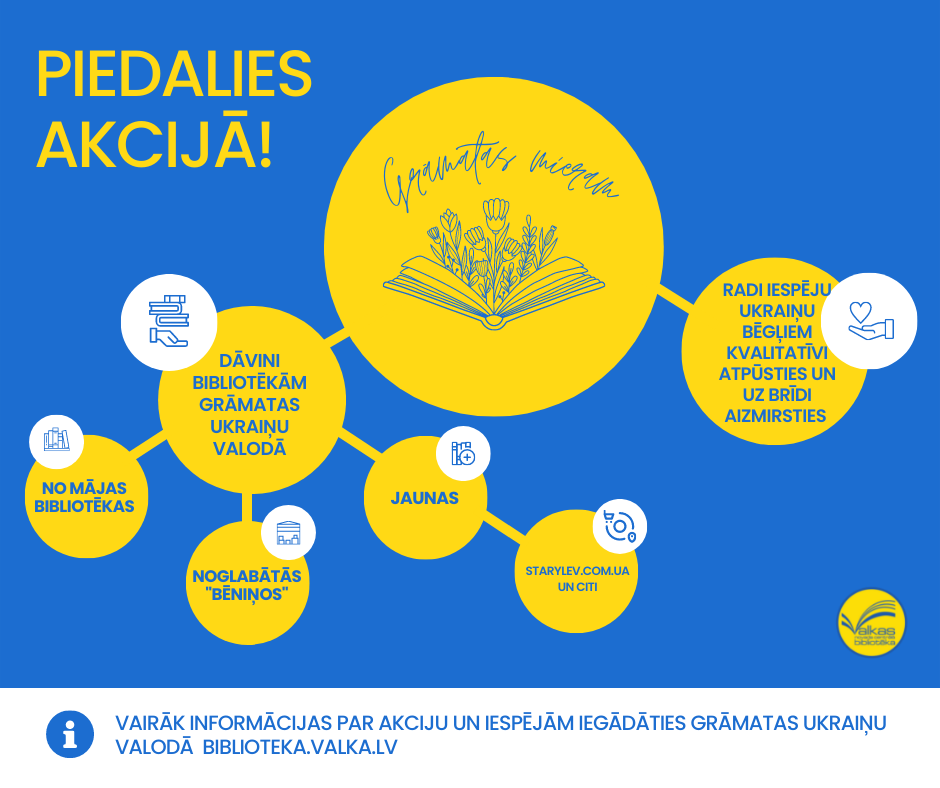 Kopš kara sākšanās Ukrainā Valkas novads ir kļuvis par mājām vairākām ukraiņu ģimenēm, bērniem un jauniešiem, savukārt bibliotēka – par svarīgu kultūrvietu, kurā griezties pēc kvalitatīvas izklaides, zināšanām un atpūtas, kas ļautu aizmirsties. Līdz šim Valkas novada pašvaldība uzņēmusi 84 bēgļus, vēl 13 dzīvo pie privātpersonām. Arvien biežāk šie cilvēki vēršas bibliotēkā ar vēlmi lasīt literatūru dzimtajā valodā, tāpēc Valkas bibliotēka aicina iesaistīties akcijā “Grāmatas mieram” un dāvināt bibliotēkai grāmatas ukraiņu valodā!