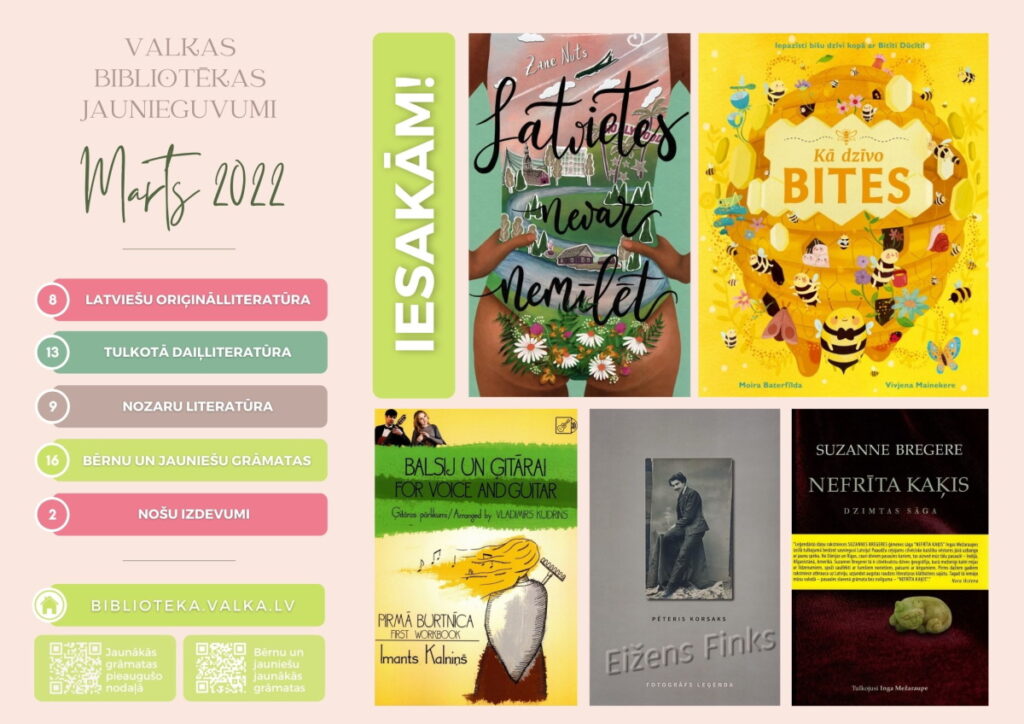 Valkas novada Centrālā bibliotēka aicina lasītājus iepazīties ar jaunajām grāmatām no 21. līdz 24. martam. Jauno grāmatu izsniegšana notiks piektdien, 25. martā.