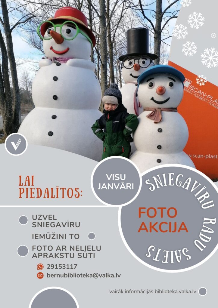 Valkas bibliotēka aicina ikvienu – bērnus, jauniešus, pieaugušos, ģimenes, vecvecākus, kolektīvus u.c. interesentus – visa janvāra garumā iesaistīties sniegavīru foto akcijā “Sniegavīru radu saiets”.