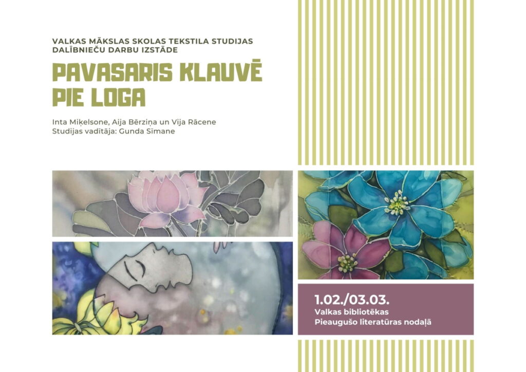 Pavasari gaidot, Valkas bibliotēkas Pieaugušo literatūras nodaļā līdz 3.martam ikviens interesents aicināts uz izstādi “Pavasaris klauvē pie loga”. Ekspozīciju veido Valkas mākslas skolas tekstila studijas dalībnieču – Intas Miķelsones, Aijas Bērziņas un Vijas Rācenes – vairāk kā divdesmit tekstila gleznas dažādās tehnikās. Tematikā dominējošā ir dabas tēma – ziedi, putni, koki, arī klusā daba un portreti.