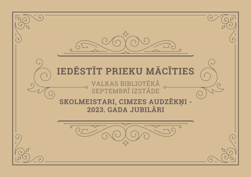 Uzsverot pedagogu nozīmīgumu intelektuālas, kulturālas un humānas sabiedrības veidošanā un atzīmējot jaunā mācību gada sākšanos, visu septembri Valkas bibliotēkas novadpētniecības stendā apskatāma izstāde “Iedēstīt prieku mācīties. Skolmeistari, Cimzes audzēkņi – 2023. gada jubilāri”. Ekspozīcijā apkopotie materiāli sniegs ieskatu Jāņa Cimzes Vidzemes skolotāju semināra audzēkņu – Apsīšu Jēkaba (1858–1929), Augusta Kažoka (1863–1893), Jēkaba Pilsātnieka (1838–1879), Jēkaba Zvaigznītes (1833–1867), Toma Gailīša-Gaiduļa (1843–1917), Jāņa Kauliņa (1863–1940), Jāņa Klāviņa (1843–1902) un Eduarda Inzelberga (1858–1930) biogrāfijās.