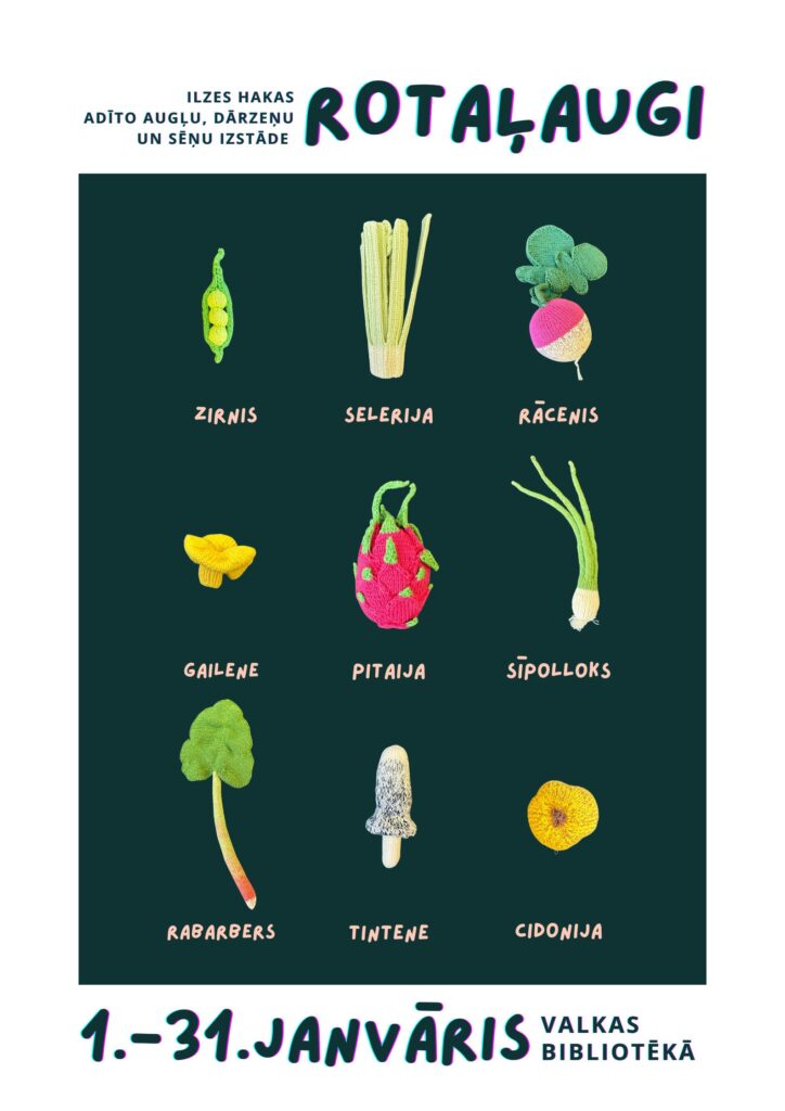 Tikai janvārī Valkas bibliotēkā apskatāma rokdarbnieces Ilzes Hakas darbu izstāde ”Rotaļaugi”. Ekspozīcijā iekļauti teju 100 reālistiska izskata un izmēra adīti dārzeņi, sēnes, augļi un ogas, kas sastopami gan piemājas dārzā, vietējā mežā un veikalā, gan ļoti reti un eksotiski eksemplāri.