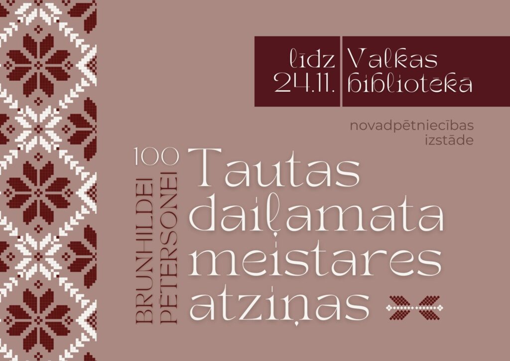 Patriotiskākajā no mēnešiem Valkas bibliotēkā apskatāma Tautas lietišķās mākslas studijas (TLMS) “Saulīte” ilggadējās vadītājas Brunhildes Pētersones simtajai jubilejai veltīta izstāde “Tautas daiļamata meistares atziņas”. Starp ekspozīcijas materiāliem, kas sniedz ieskatu meistares radošajā un izglītojošajā darbā, izceltas spilgtākās Brunhildes Pētersones un viņas laikabiedru atziņas par darbu, dzīvi un vērtībām, kas lolojamas vēl šodien.