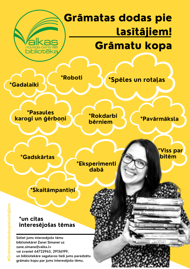 Lai pieteiktu grāmatu kopas sagatavošanu un saņemšanu, rakstīt vai zvanīt bibliotekārei Zanei Sīmanei (e-pasts: zane.simane@valka.lv, tel. 64722965 vai 29136199).