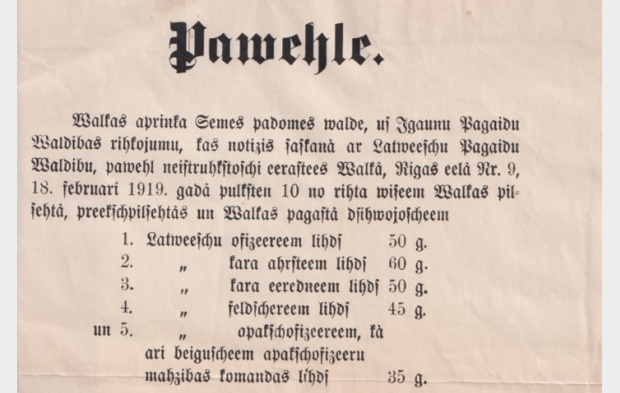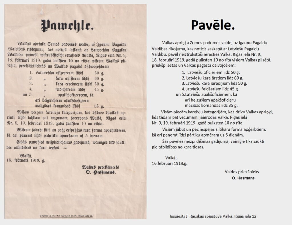 Valkas novadpētniecības muzejs ir saņēmis vērtīgu dāvinājumu – Jāņa Rauskas tipogrāfijā Valkā, Rīgas ielā 12 iespiesto 1919.gada 16.februārī Valkas apriņķa Zemes padomes priekšsēdētāja Oto Hasmaņa parakstīto pirmo pavēli par mobilizācijas izsludināšanu Ziemeļlatvijā.