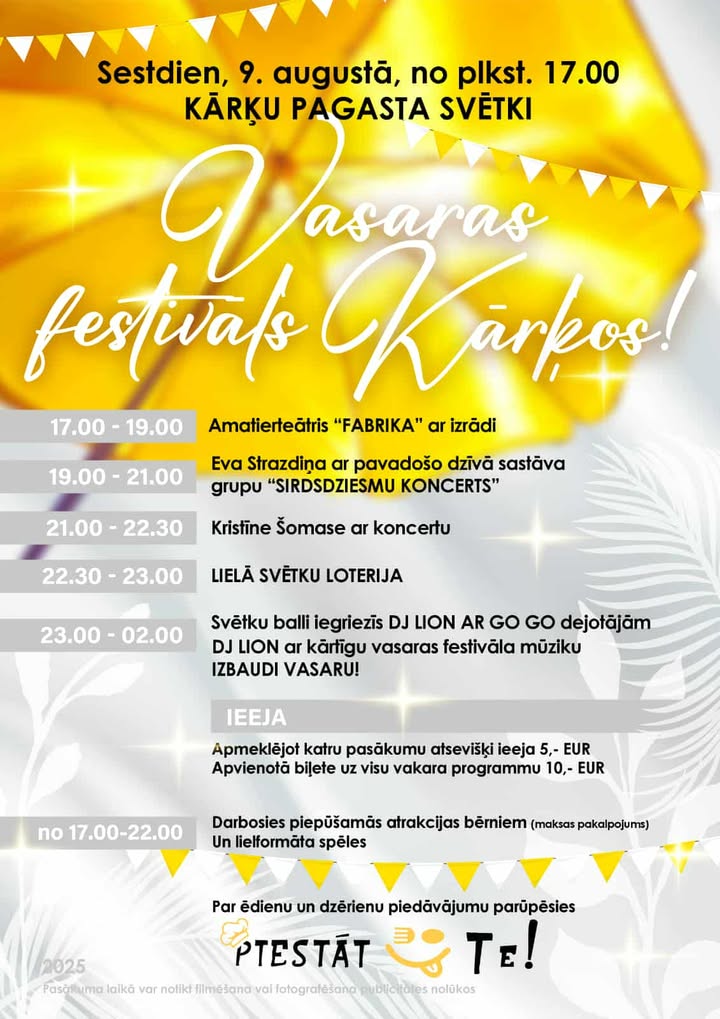 Sestdien, 9. augustā, no pulksten 17.00 norisināsies Kārķu pagasta svētki “Vasaras festivāls Kārķos”.