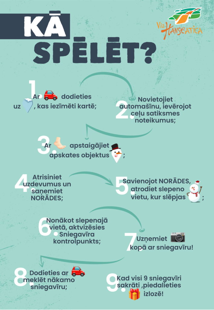 No 27. novembra līdz 16. janvārim starptautiskais tūrisma ceļš “Via Hanseatica” sadarbībā ar “Aktīvā tūrisma centrs Eži” un “Cilpo.lv” aicina ģimenes ar bērniem un romantiķus piedalīties ceļošanas spēlē “Sniegavīru paslēpes Vidzemē”. Deviņās vietās Vidzemē būs paslēpušies īpaši sniegavīri. Visus deviņus atrodot, būs iespēja piedalīties pārsteiguma balvu izlozē. Dalība spēlē – bez maksas.