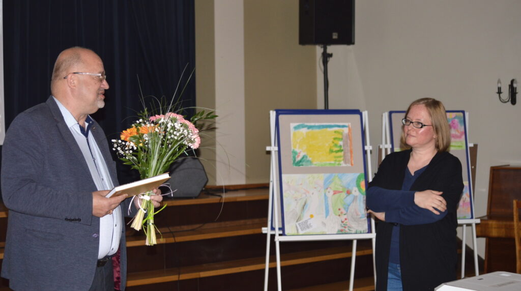 “Lai Artura monogrāfija iznāk ātrāk!” ar šādu vēlējumu Valkas novada domes priekšsēdētājs Vents Armands Krauklis uzdāvināja Artura Gobas meitai Baibai Gobai monogrāfiju par valstsvīru Voldemāru Robertu Zāmuelu, kura personība un devums Latvijai plašākai sabiedrībai līdz šim nebija zināma. Foto: Sandra Pētersone