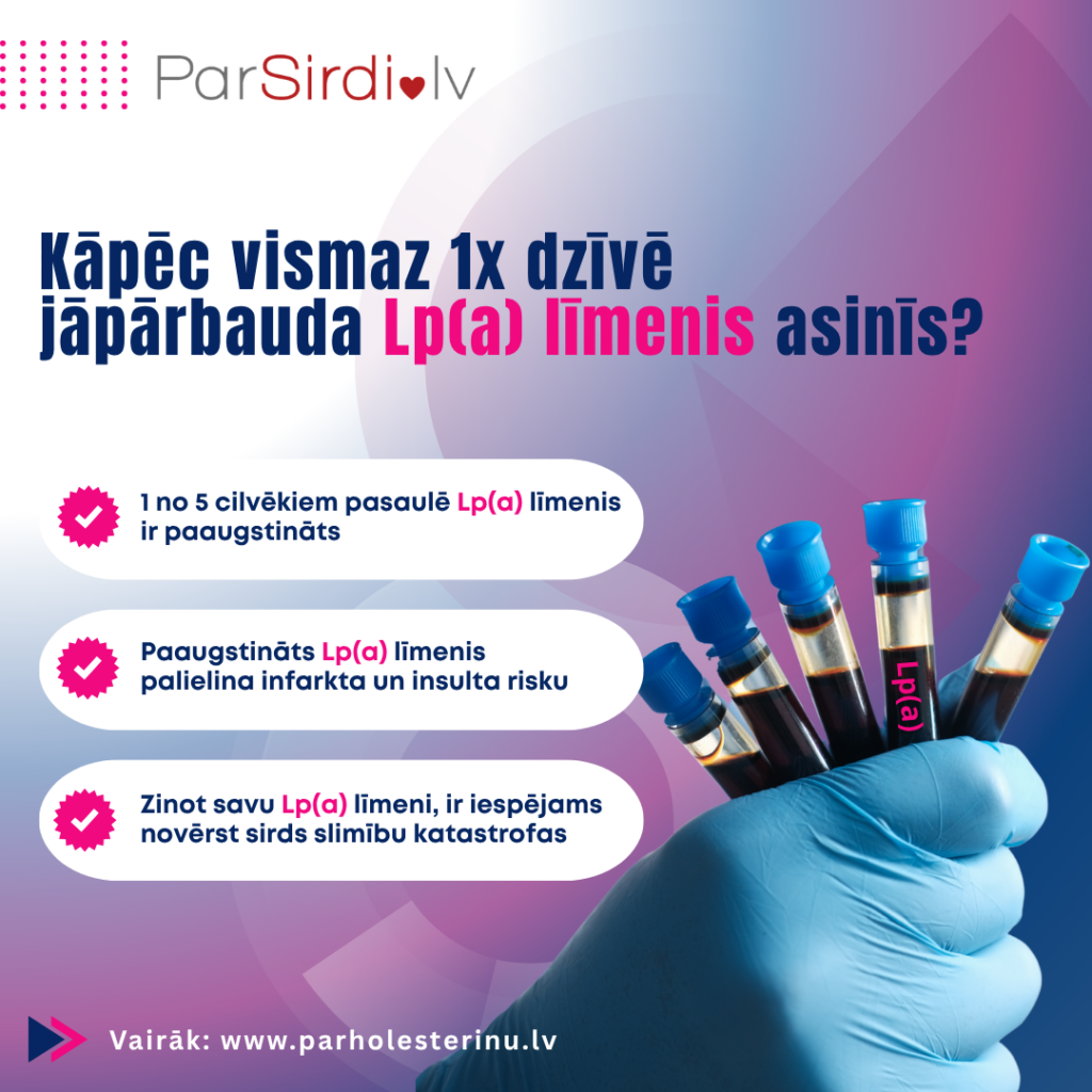 Atzīmējot Starptautisko Lipoproteīna(a) jeb Lp(a) atpazīstamības dienu 24.martā, biedrība ParSirdi.lv kopā ar kardiologiem aicina pievērst uzmanību šim bieži nepamanītajam, bet būtiskajam sirds un asinsvadu slimību riska faktoram, kā arī aktualizē nepieciešamību Latvijā uzlabot tā savlaicīgu diagnostiku.