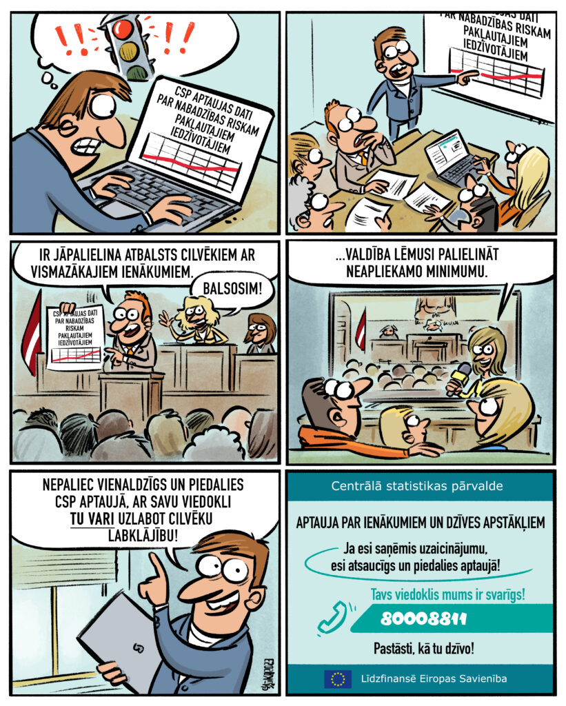 “Saņemam informāciju, ka iedzīvotāji, īpaši vecāka gadagājuma, bažījas par krāpniecisku zvanu un nevēlas turpināt sarunu ar CSP intervētāju. Aicinu uzticēties CSP intervētājam, kurš, uzsākot sarunu, vienmēr stādīsies priekšā, un turpināt sarunu. Jā, CSP iedzīvotājiem jautā arī par ienākumiem, bet mēs neprasām viņu bankas datus, un tā ir būtiska atšķirība no krāpniekiem, kuri cenšas izvilināt no iedzīvotājiem informāciju par viņu bankas kontiem vai maksājumu kartēm. Statistiku par iedzīvotāju labklājību un nabadzības rādītājiem valsts un pašvaldību iestādes ik gadu iegūst no CSP veiktās iedzīvotāju aptaujas, un tā tiek izmantota pabalstu pārskatīšanai, tāpēc par ienākumiem mums reizi gadā ir jāvaicā,” CSP intervētāju zvaniem aicina uzticēties Sociālās statistikas departamenta direktore Baibai Zukula.
