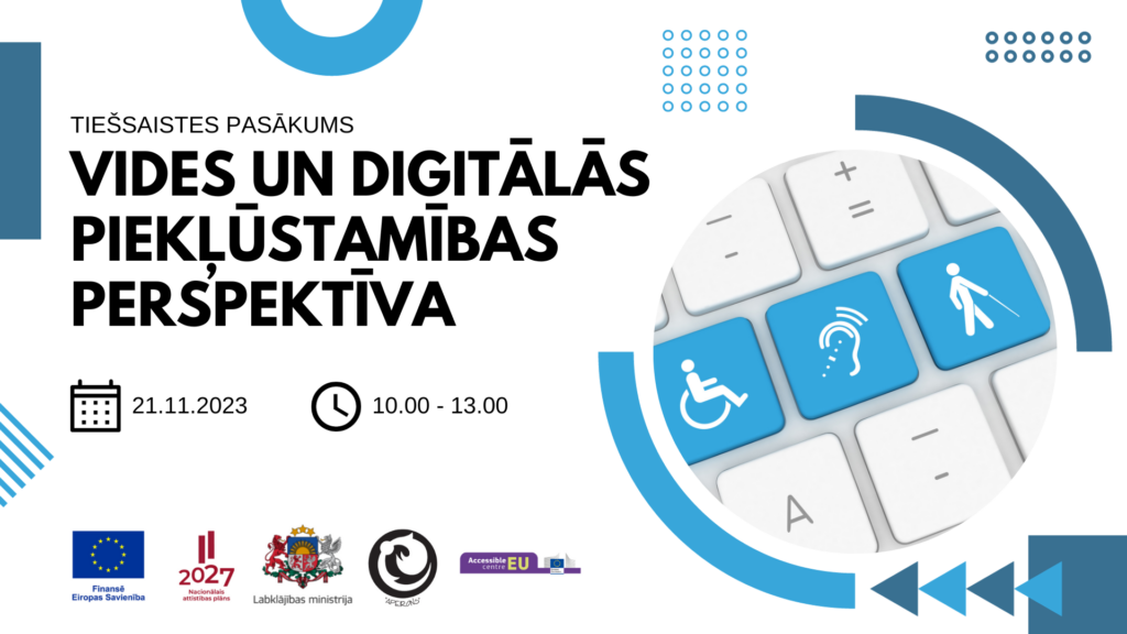 2023. gada 21. Novembrī no 10.00 – 13.00 Labklājības ministrija, nodibinājums “Invalīdu un viņu draugu apvienība “Apeirons”” un Accessible EU aicina interesentus pieteikties tiešsaistes pasākumam – “Vides un digitālās piekļūstamības perspektīva”, kurš norisinās “Metodiskā atbalsta Eiropas Savienības fondu projektu īstenotājiem par vides un informācijas piekļūstamības nodrošināšanu” pasākuma ietvaros.