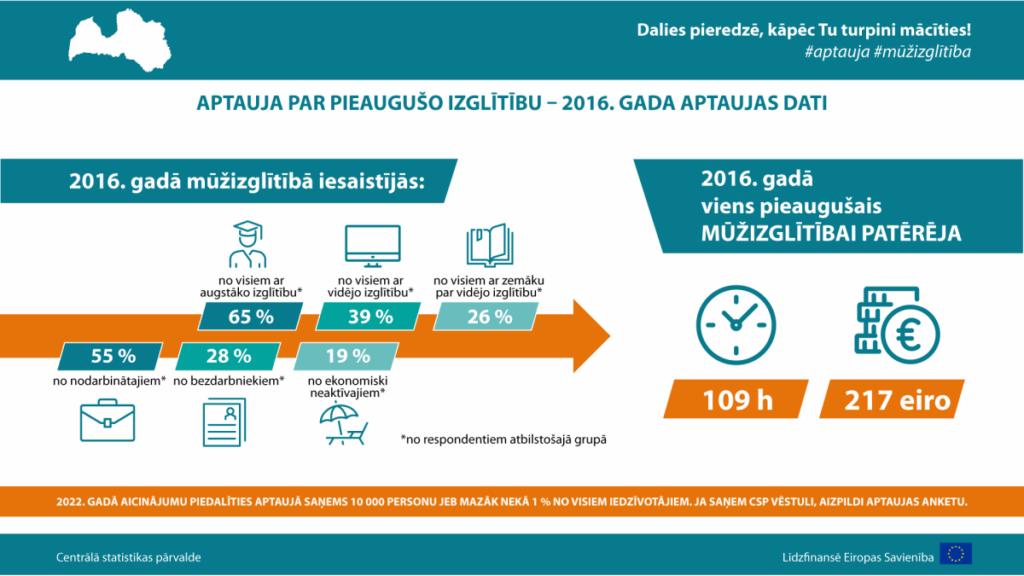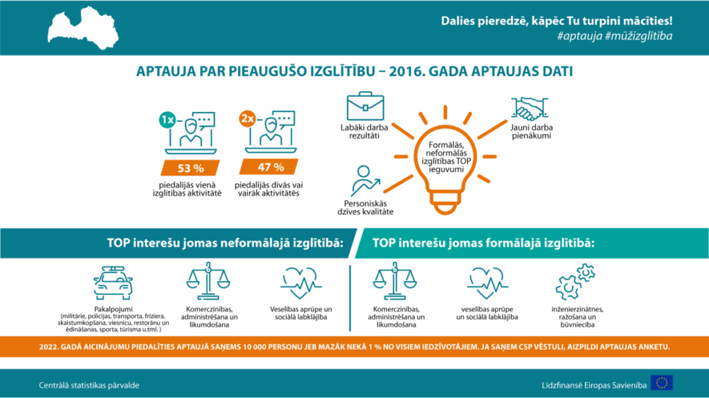 1. septembrī Centrālā statistikas pārvalde (CSP) uzsāk iedzīvotāju aptauju par pieaugušo izglītību, kurā jautās par iegūto izglītību, nepabeigto izglītību, neformālo izglītību, kā arī par iespējām un motivāciju mācīties. Aptaujas dalībniekiem būs jāatbild par izglītošanās pieredzi pēdējo 12 mēnešu laikā gan formālās, gan neformālās* izglītības programmās, kā arī pašmācībā. Vaicās arī par vecāku izglītības līmeni.