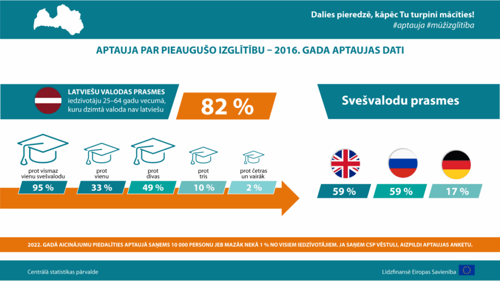 Turklāt šajā aptaujā noskaidros dzimto un mājās lietoto valodu, t.sk. latgaliešu valodas lietošanu ikdienā, par ko pēdējie dati ir no 2011. gadā veiktās tautas skaitīšanas. Vaicās arī par iedzīvotāju svešvalodu prasmēm. Šī ir vienīgā CSP aptauja, kur tiek iegūti dati par valodu lietojumu un svešvalodu zināšanām – 2016. gadā 95 % no pieaugušo izglītībā iesaistītajiem norādīja, ka prot kādu svešvalodu.