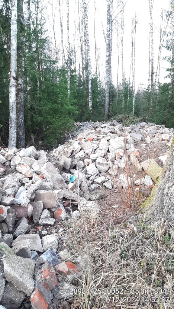 Līdzīga situācija atklāta kādā nekustamajā īpašumā Vaives pagastā, Cēsu novadā, kur nelegāli novietoti un uzglabāti būvniecības atkritumi, piemēram, betons, ķieģeļi, drupināts asfalts un citi materiāli. No atkritumiem izveidots laukums aptuveni 47 m² platībā, kā arī ceļa uzbērums mežā, apmēram 50 m garumā un 1,5 m augstumā, kas sastāvēja no būvju nojaukšanas atkritumiem, galvenokārt nesmalcināta betona un ķieģeļu. Pārbaudot būvniecības informācijas sistēmu, netika identificētas būvniecības lietas šī laukuma un ceļa izbūvei.