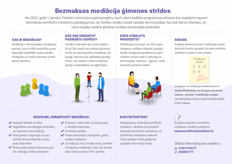 Tieslietu ministrija sadarbībā ar Sertificētu mediatoru padomi turpina īstenot programmu “Mediācija ģimenes strīdos”, lai sniegtu bezmaksas atbalstu ģimenēm strīdu gadījumos, kas skar bērnu intereses. Programmas ietvaros ģimenēm ir iespēja izmantot 5 valsts apmaksātas mediācijas stundu sesijas, bet gadījumos, ja ģimenei ir trūcīgā vai maznodrošinātās ģimenes statuss – 7 valsts apmaksātas mediācijas stundu sesijas.