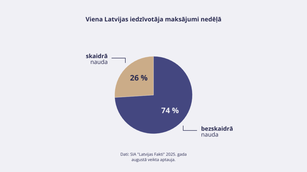 Bezskaidrās un skaidrās naudas maksājumu attiecība Latvijā 2025. gada augustā bijusi 74 % pret 26 %, liecina jaunākais, 2025. gada rudens, Latvijas Bankas “Maksājumu radars”. Skaidrā nauda ir atguvusi pozīcijas, tuvojoties 2023. gada augusta līmenim (27 %), pēc tam, kad 2025. gada februārī tika novērots vēsturiski augstākais bezskaidrās naudas maksājumu īpatsvars (78 %).