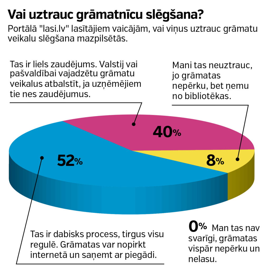 Ņemot vērā šo tendenci, kā arī grāmatnīcu simbolisko nozīmi un līdz ar to sabiedrības sentimentu, kas tieši šajā uzņēmējdarbības virzienā vēlas saskatīt kādu īpašu vērtību, “Latvijas Avīze” aprunājās ar trīs lielāko valsts grāmatnīcu ķēžu vadītājām, kuru pārziņā ir 82 no šobrīd visā Latvijā pastāvošajiem 115 grāmatu veikaliem.