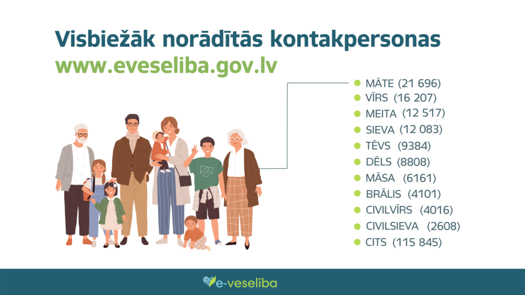 Šobrīd E-veselības portālā kontakpersonas reģistrējuši vairāk nekā 176 tūkstoši iedzīvotāju. Kāds ir izvēlējies tikai vienu, bet cits norādījis vairākas kontaktpersonas. Nepilnos 116 tūkst. gadījumu iedzīvotāji nav norādījuši savu un kontaktpersonas radniecību. Savukārt gadījumos, kad tā ir minēta, visbiežāk kā kontaktpersona norādīta māte, vīrs, sieva vai meita.
