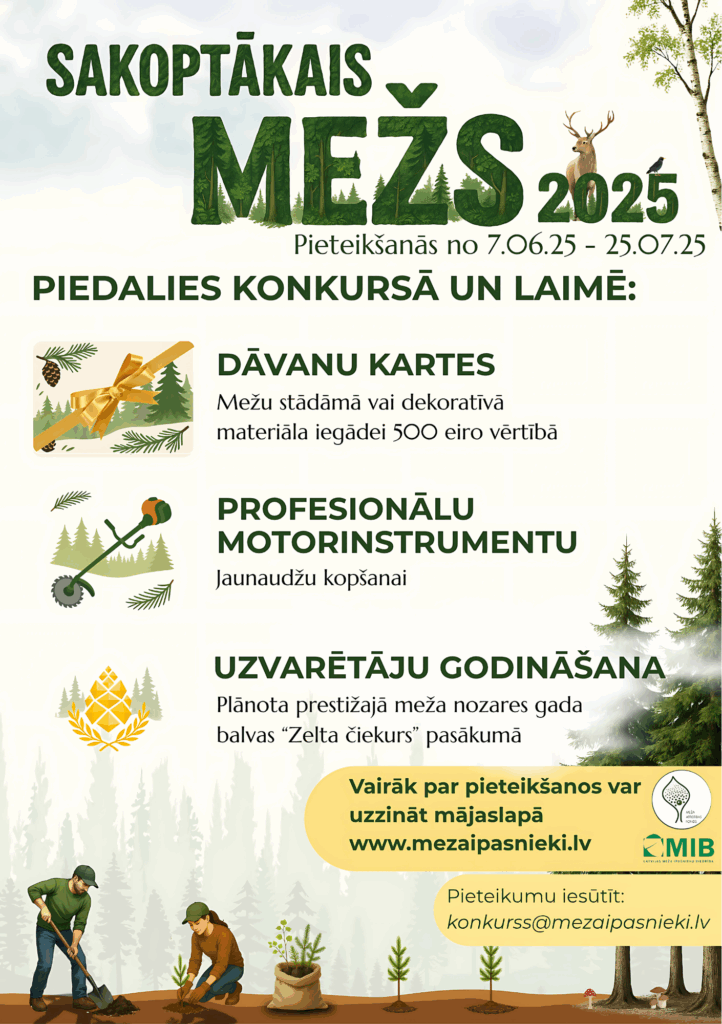 Konkursa nolikums un papildu informācija par pieteikšanos un vērtēšanas kritērijiem meklējami šeit: https://mezaipasnieki.lv/lv/piesakies-konkursam-sakoptakais-mezs-2025 Konkursa organizētājs ir Latvijas Meža īpašnieku biedrība.