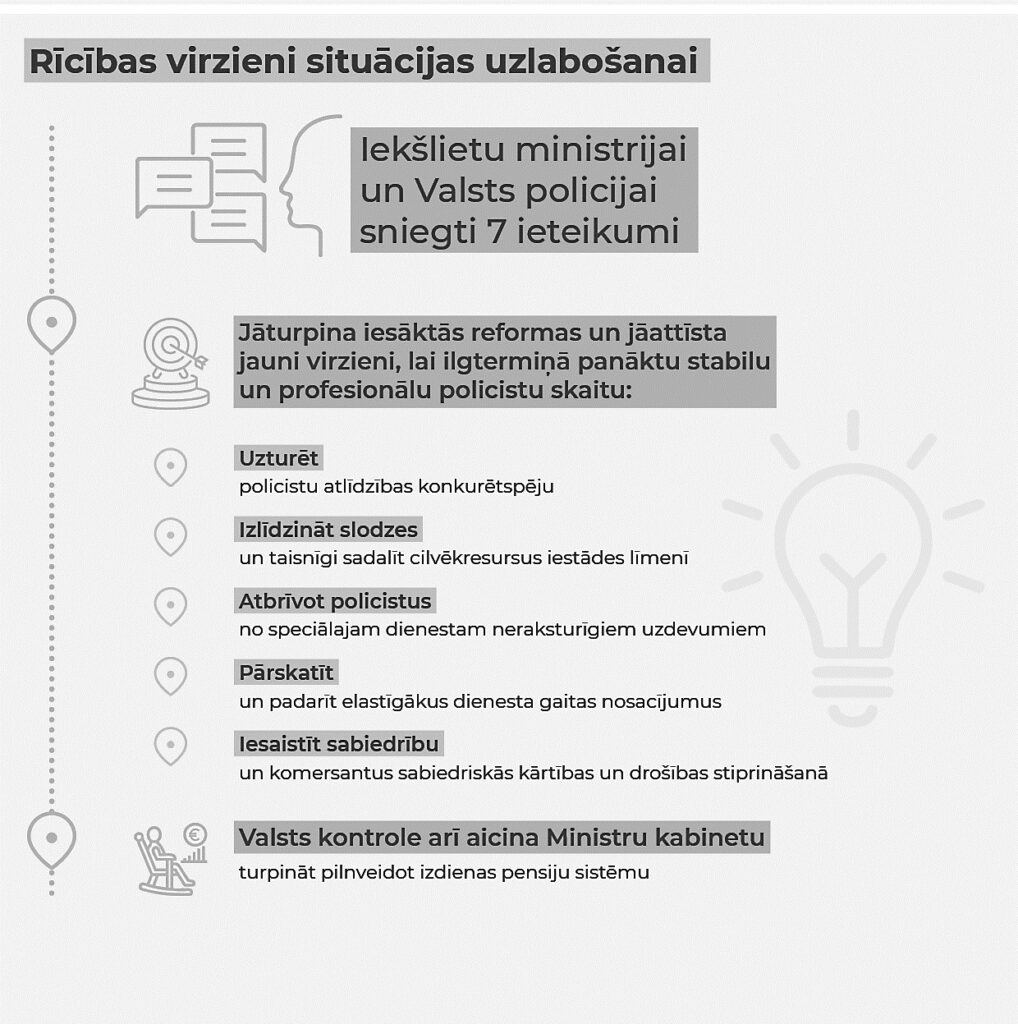 Lai risinātu policistu trūkumu un uzlabotu policijas darba efektivitāti, Valsts kontrole ministrijai un Valsts policijai sniegusi septiņus ieteikumus. To ieviešana izlīdzinās policistu noslodzi, ļaus efektīvāk izmantot policistus kritiski svarīgu policijas funkciju izpildei, veicinās pieredzējušu policistu noturēšanu dienestā. Tāpat policisti tiks atslogoti no to klātbūtnes mazāk nozīmīgu situāciju risināšanā, plašāk iesaistot sabiedrību un komersantus. Vienlaikus Valsts kontrole aicina Ministru kabinetu pilnveidot izdienas pensiju sistēmu, lai tā atbilstu valsts drošības interesēm, dienestu cilvēkresursu vajadzībām, valsts budžeta iespējām un taisnīguma principam attiecībā pret pārējo sabiedrību.