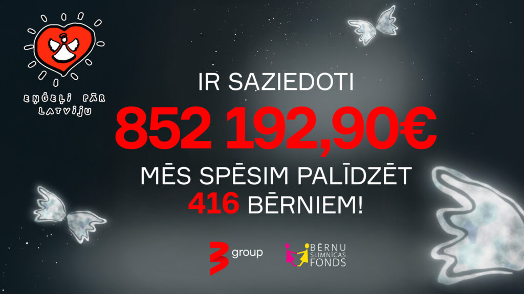 TV3 Group labdarības akcija “Eņģeļi pār Latviju” savu kulmināciju, kā jau ierasts, piedzīvoja pērn – īsi pirms Ziemassvētkiem labestības koncertā, taču sabiedrības iesaiste ziedošanā turpinājās līdz pat šī gada 31. janvārim. Vienojoties labestībā, kopīgiem spēkiem akcijas ietvaros tika saziedoti 852 192, 90 eiro, kas nodrošinās ārstniecības un rehabilitācijas pakalpojumus 416 bērniem visā Latvijā.