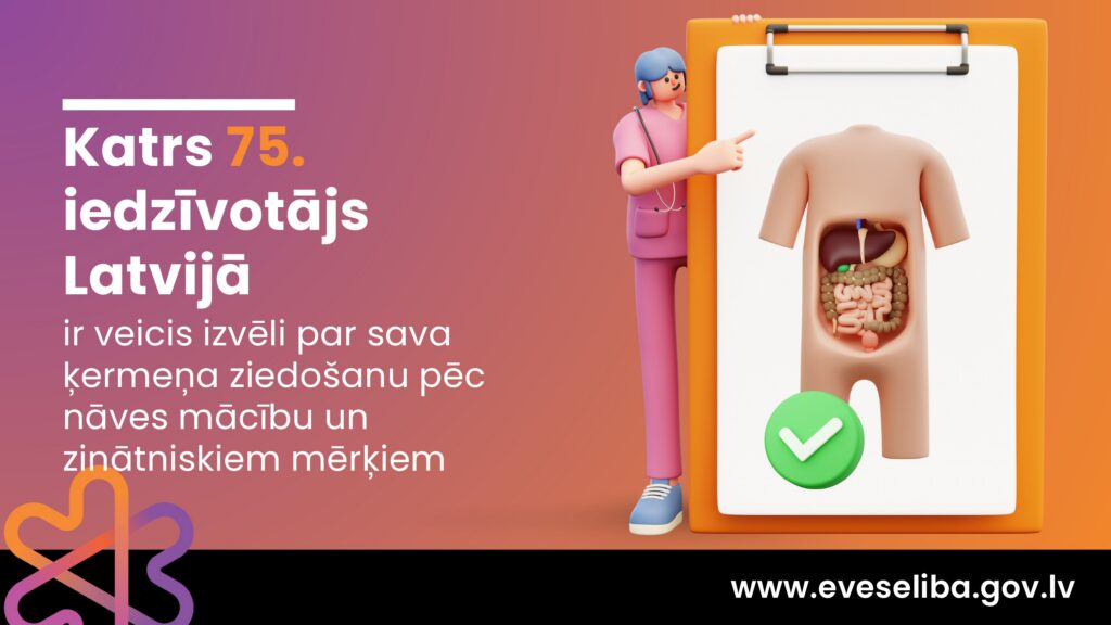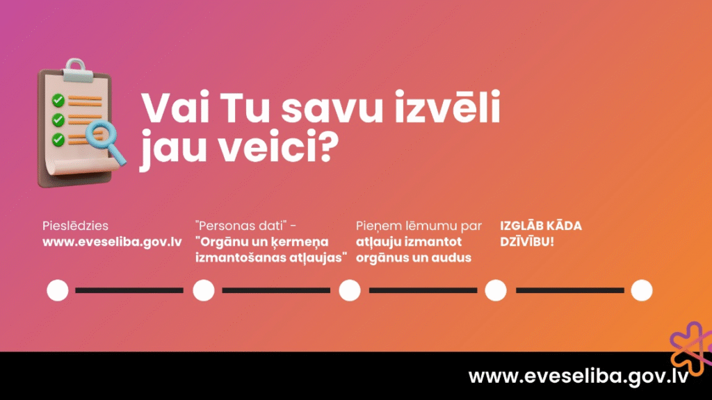 Ņemot vērā zemo Latvijas iedzīvotāju iesaisti ķermeņa, orgānu vai audu ziedošanā, LDVC aicina iedzīvotājus norādīt savu izvēli par ķermeņa, orgānu vai audu ziedošanu un veikt atbilstošu atzīmi valsts E-veselības sistēmas tīmekļvietnē www.eveseliba.gov.lv. Lai izteiktu savu gribu, ir nepieciešams autentificēties E-veselības sistēmā un izvēlēties sadaļu “Personas dati” – “Orgānu un ķermeņa izmantošanas atļaujas”. LDVC uzsver, ka veikto izvēli iedzīvotājs var mainīt jebkurā laikā.